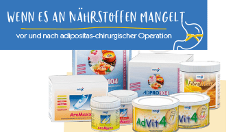 Nach einem adipositas-chirurgischen Eingriff arbeitet das Verdauungssystem nicht mehr in der gewohnten Weise. Nicht selten kommt es zu einem Mangel in der Nährstoffversorgung. Jetzt gilt es diesem Mangel entgegenzuwirken! AdPro104 zur Ergänzung bei erhöhtem Eiweißbedarf und wenn zu wenig Eiweiß über herkömmliche Lebensmittel zugeführt wird. AroMaxx bringt geschmackliche Abwechslung in den Eiweißshake. AdVit liefert alle wichtigen Vitamine, Mineralstoffe und Spurenelemente. Und mit FibreMaxx können ganz einfach Getränke und Speisen mit löslichen Ballaststoffen aufgewertet werden.